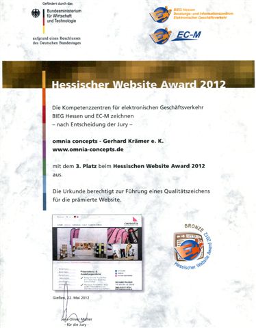 Am vergangenen Dienstag wurden im Gießener Rathaus die hessischen Website-Awards verliehen. Mit Stolz nahm das Marketing-Team von omnia concepts den dritten Platz aus über hundert Einsendungen entgegen. Über ein Jahr lang hat das Team zusammen mit Sabrina Radke (die pistazie) und der Firma 3spin an den Inhalten und der Gestaltung des neuen Unternehmensauftrittes gearbeitet – im Februar dieses Jahres wurde die Website live geschaltet. Wir freuen uns über die Auszeichnung und finden, die Arbeit hat sich gelohnt!