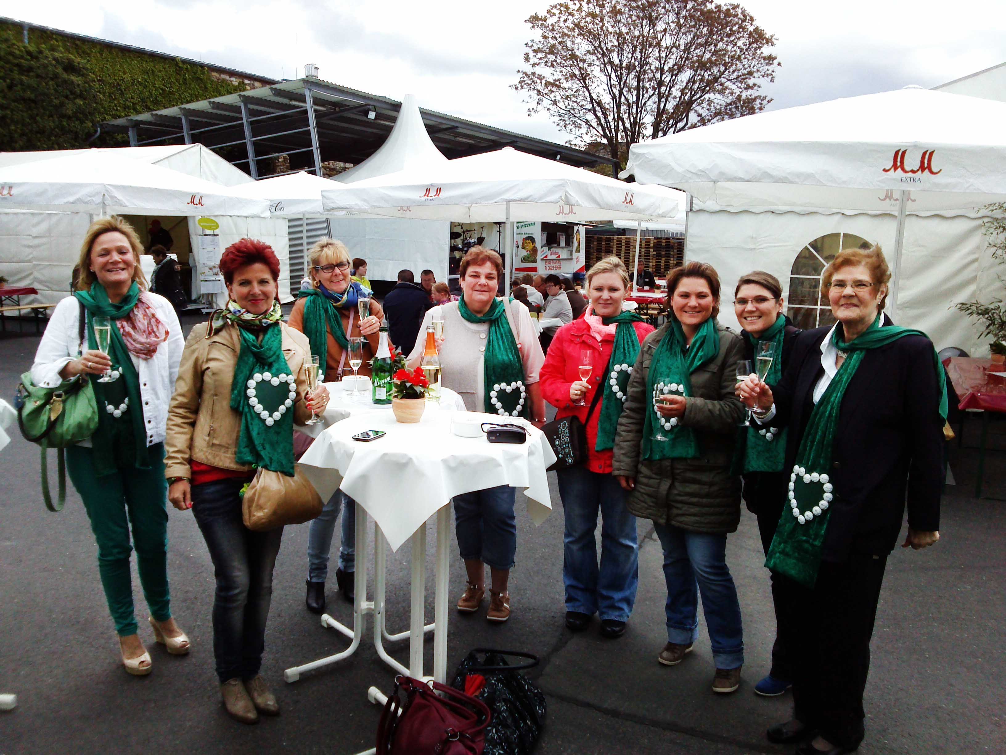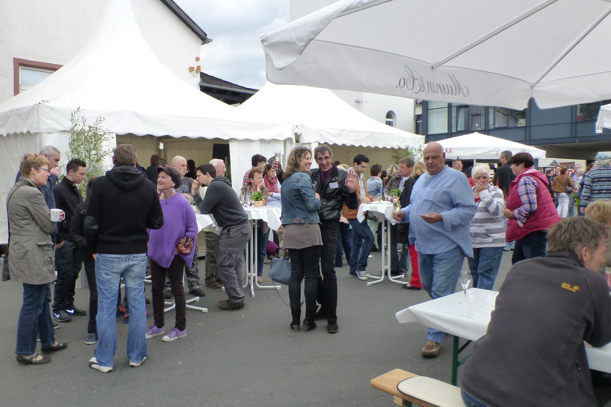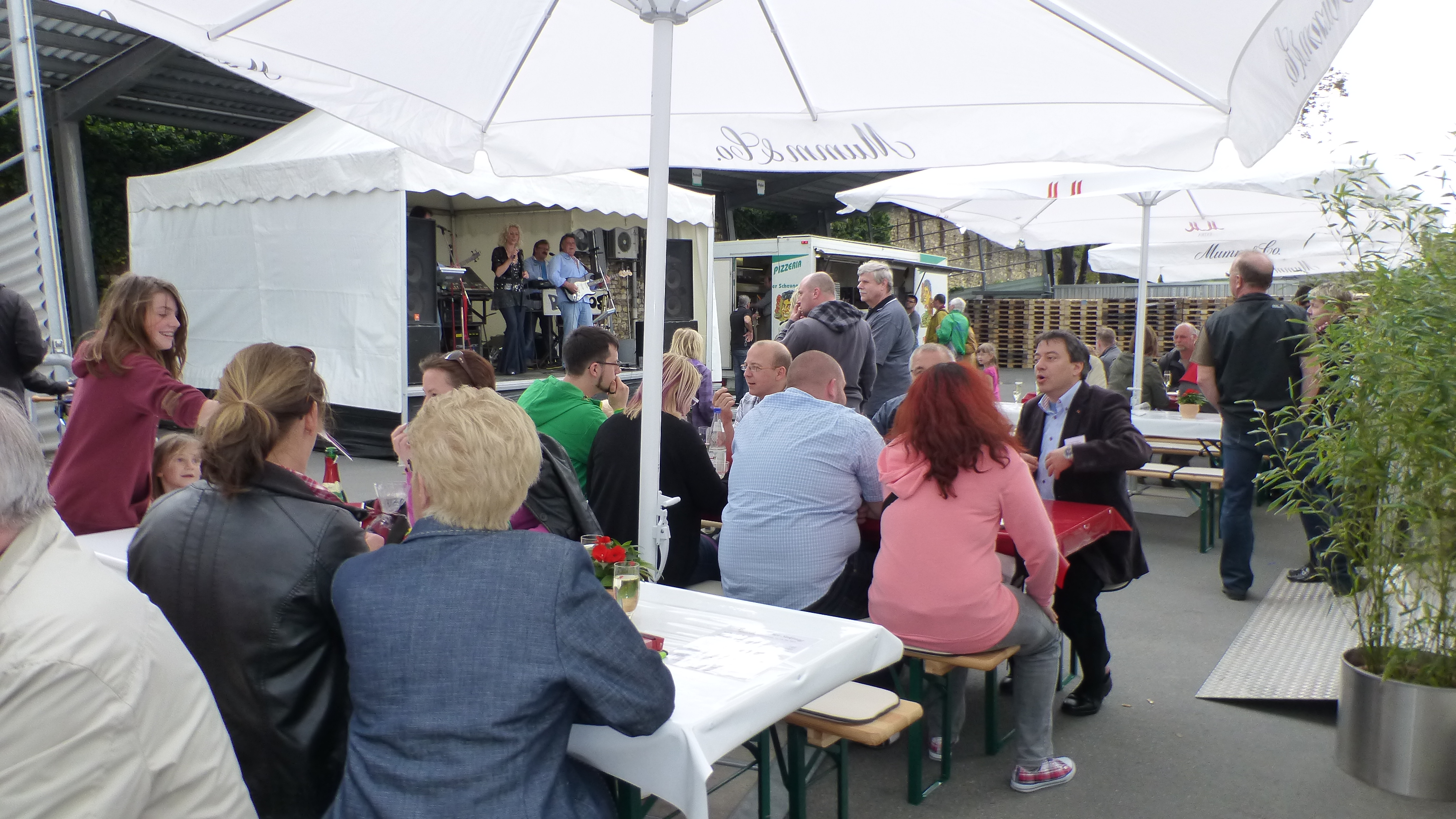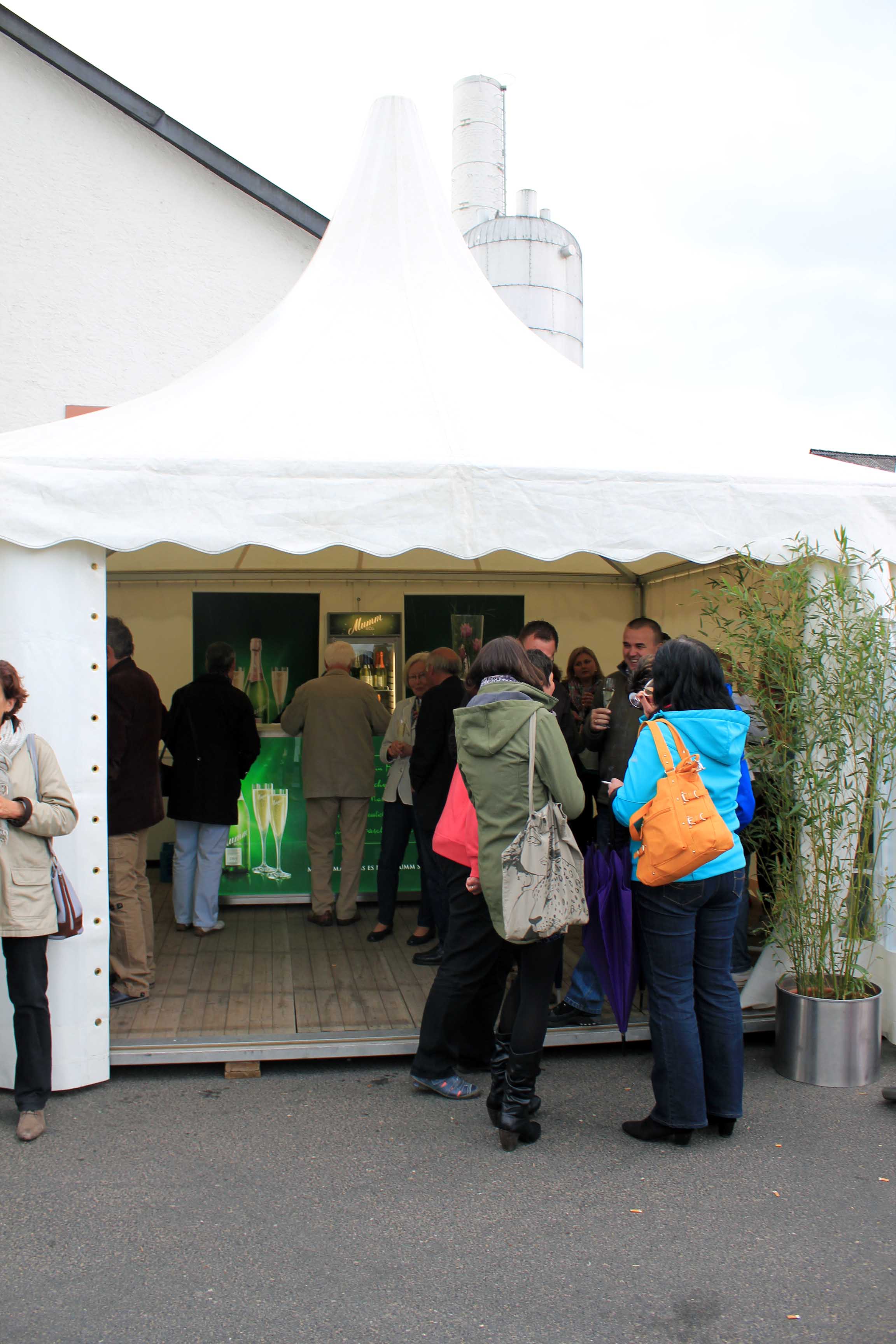 Obwohl das Wetter nicht so recht mitspielen wollte, tat das der Stimmung des Publikums und des omnia-Teams keinerlei Abbruch. Auf strahlenden Sonnenschein folgte oft nur Minuten später stürmischer Regen, der die Besucher von den im Freien aufgestellten Tischen in die Pagodenzelte und das Festzelt trieb. Doch niemand ließ sich die Laune verderben und kaum war der Schauer vorübergezogen, siedelte man sich wieder an den Tischen im Freien an und genoss die leckeren Sekte und Speisen.